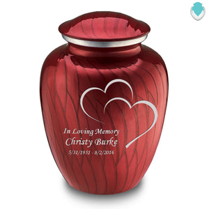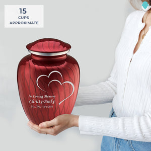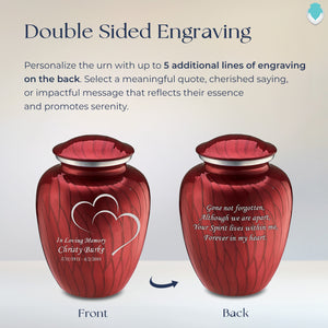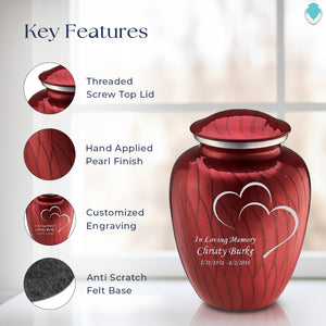 Honor the memory of your loved one with an Adult Embrace Pearl Candy Red Hearts Cremation Urn for Ashes. This beautiful urn displays two intertwined hearts. This is a perfect resting place to embody true love and affection.