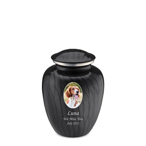 The Pet Embrace Pearl Urn features a deep glossy black finish with a brushed pewter band just below its threaded lid. The black coloring represents sophistication, strength, and power, creating a meaningful tribute to honor your beloved pet's memory.