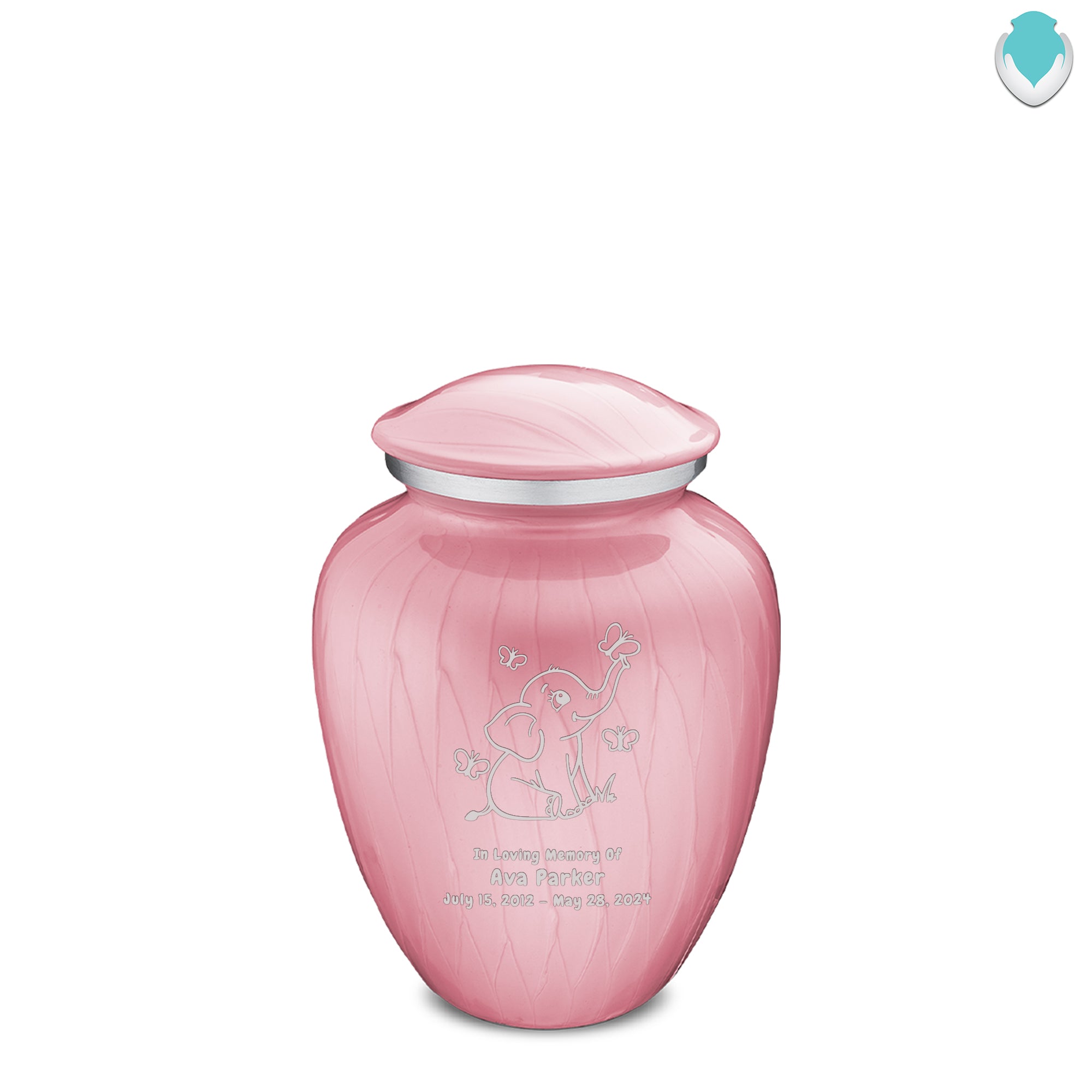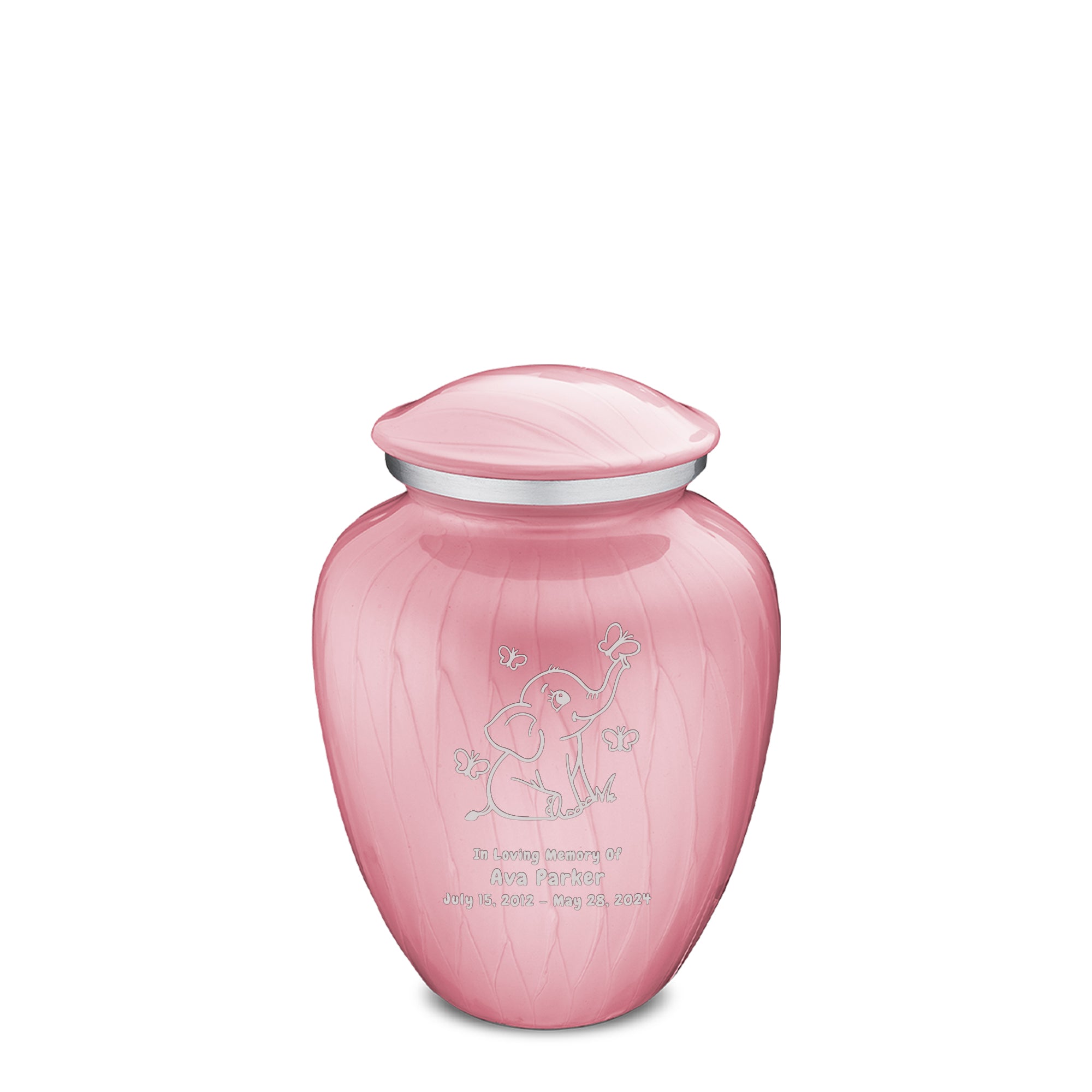 This Embrace Urn has a hand applied pearlescent pink finish with a brushed pewter band just below its threaded lid. The pink coloring represents joy, playfulness, and sweetness.