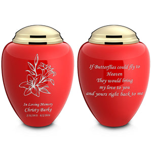 The hallmark of our Tribute Collection is the new, sleek oval silhouette in a selection of rich, gleaming colors accented with mixed metals that can only be found at GetUrns. This beautiful urn displays an elegant lily. This is a perfect resting place for someone who embodied love, hope, and passion. This cremation urn’s red body and gold cap is aesthetically pleasing, elegant, distinctive, and symbolizes confidence, courage, wisdom, and spirituality.