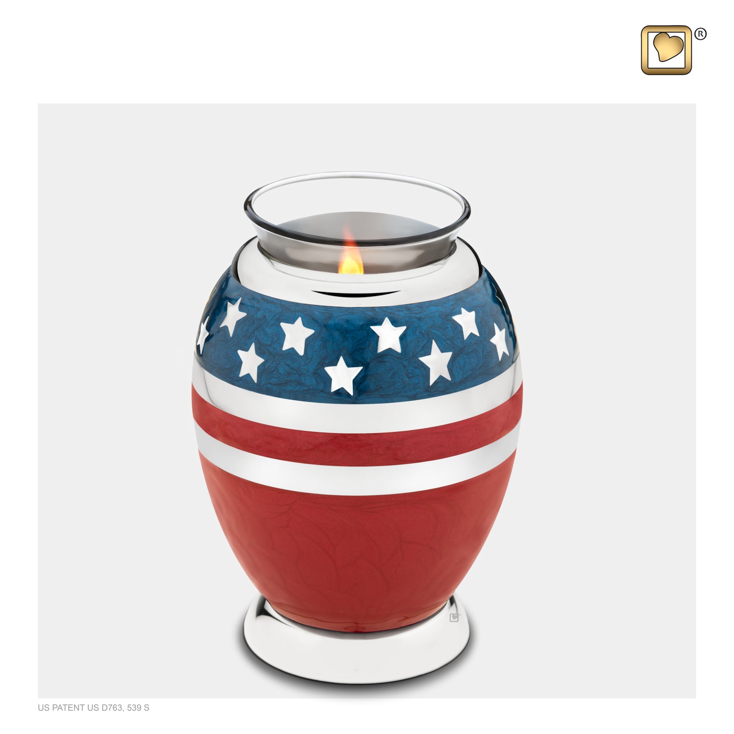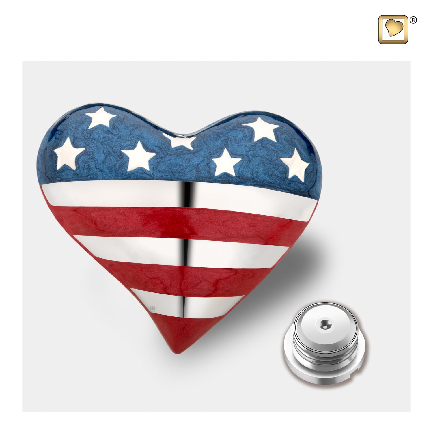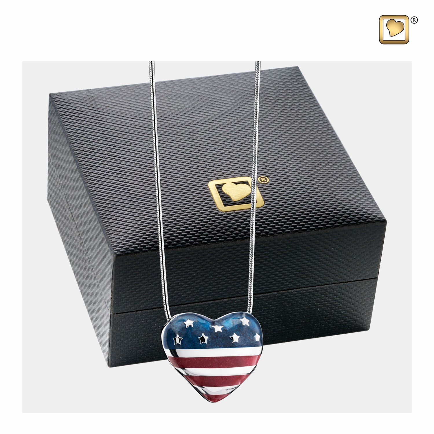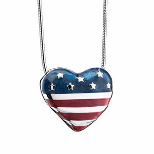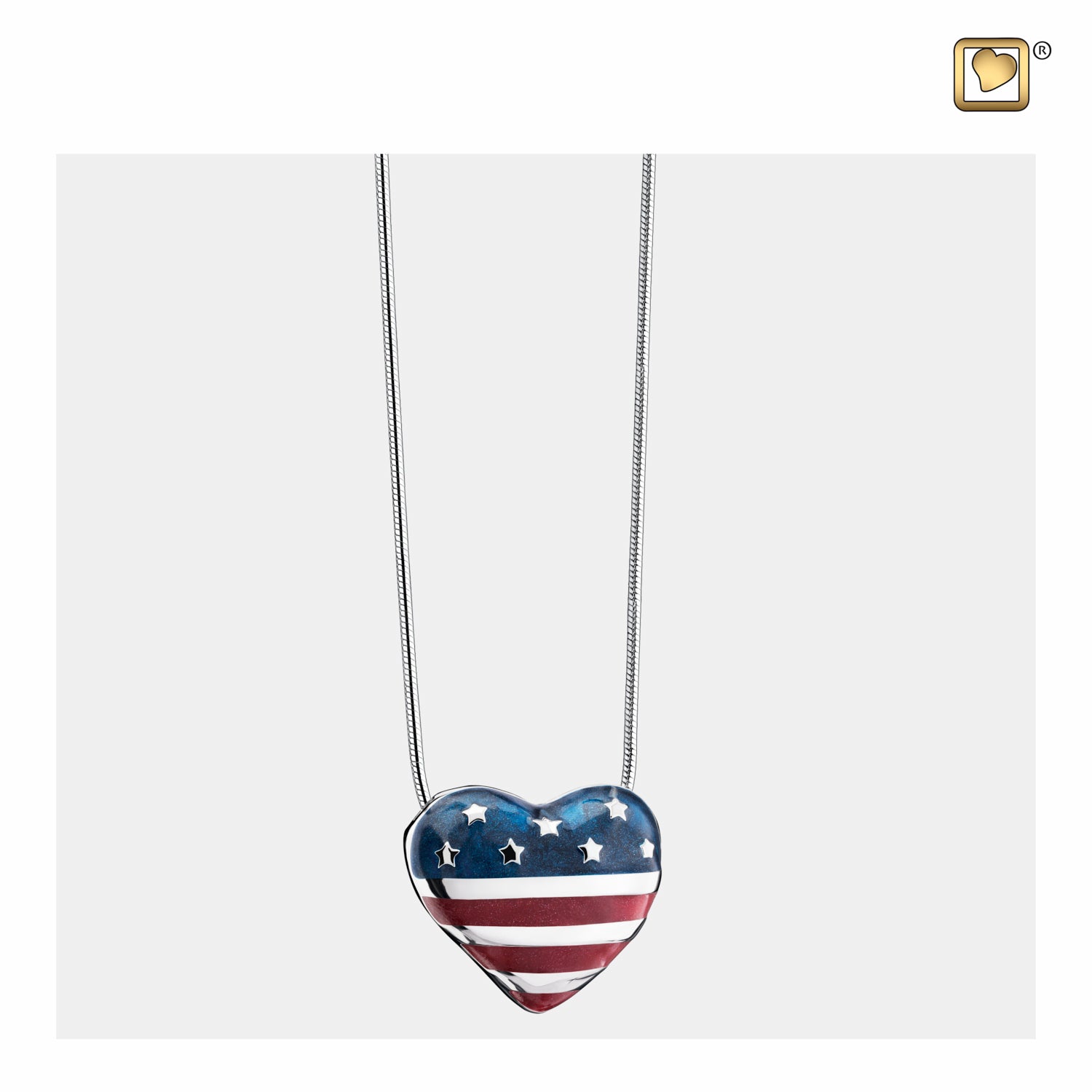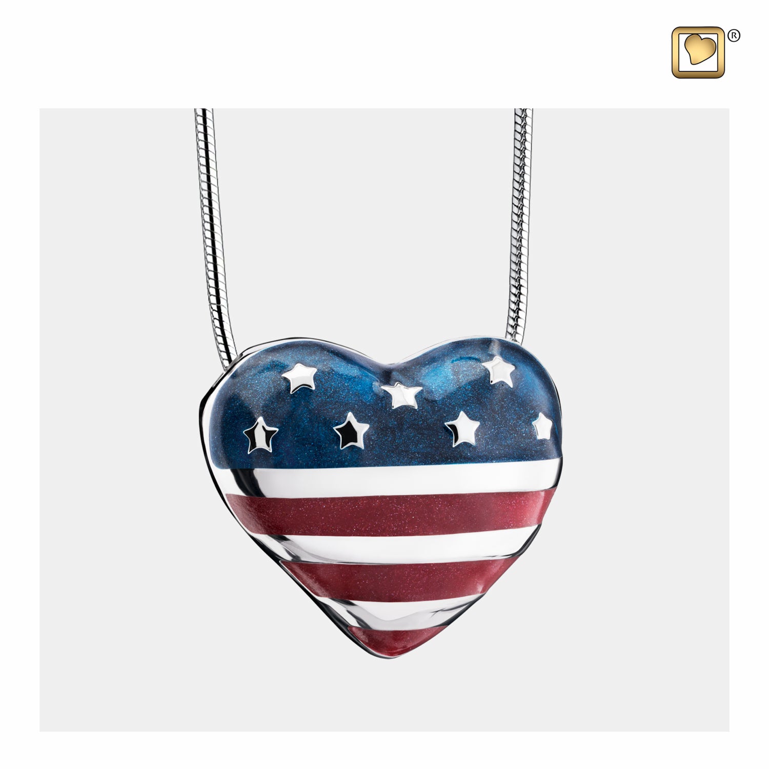 Honor the life of your loved one with this gorgeous Sterling Silver Stars and Stripes cremation pendant for ashes. This gorgeous pendant is shaped like a heart and has gorgeous blue and red stripes with silver hearts depicting the Star Spangled Banner. This memorial pendant is perfect to memorialize your dearly beloveds' love for the country or patriotism. The silver surface is protected with Rhodium Plating making it resistant to corrosion or discoloration. There is a small compartment at the back to store ashes, dried flowers or lock of hair to remember your dearly beloved. It comes with a high quality Jewellry Display box for safe storage when not being worn.