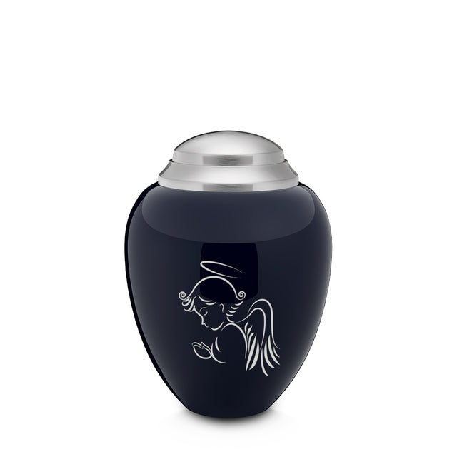 The hallmark of our Tribute Collection is the new, sleek oval silhouette in a selection of rich, gleaming colors accented with mixed metals that can only be found at GetUrns. This beautiful urn displays a praying angel. This is a perfect resting place for someone who embodied peace, love, and harmony. This cremation urn’s sophisticated navy color and graceful brushed silver cap is aesthetically pleasing, ultramodern and symbolizes freedom, loyalty, inspiration, and devotion.
