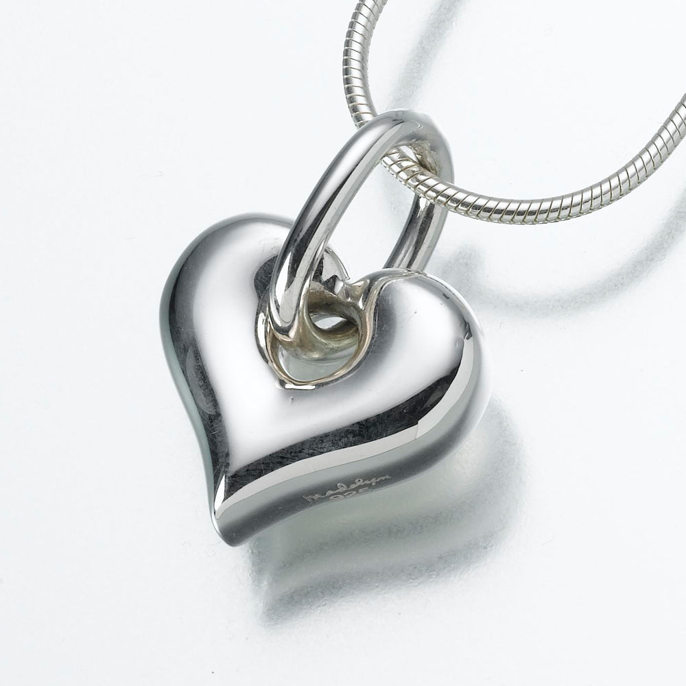 This high polished piece has a hole in the middle with an eternal ring looped through the opening of the heart. It can be filled through a screw in the back. Each piece of cremation jewelry can hold a small amount of cremation ashes.