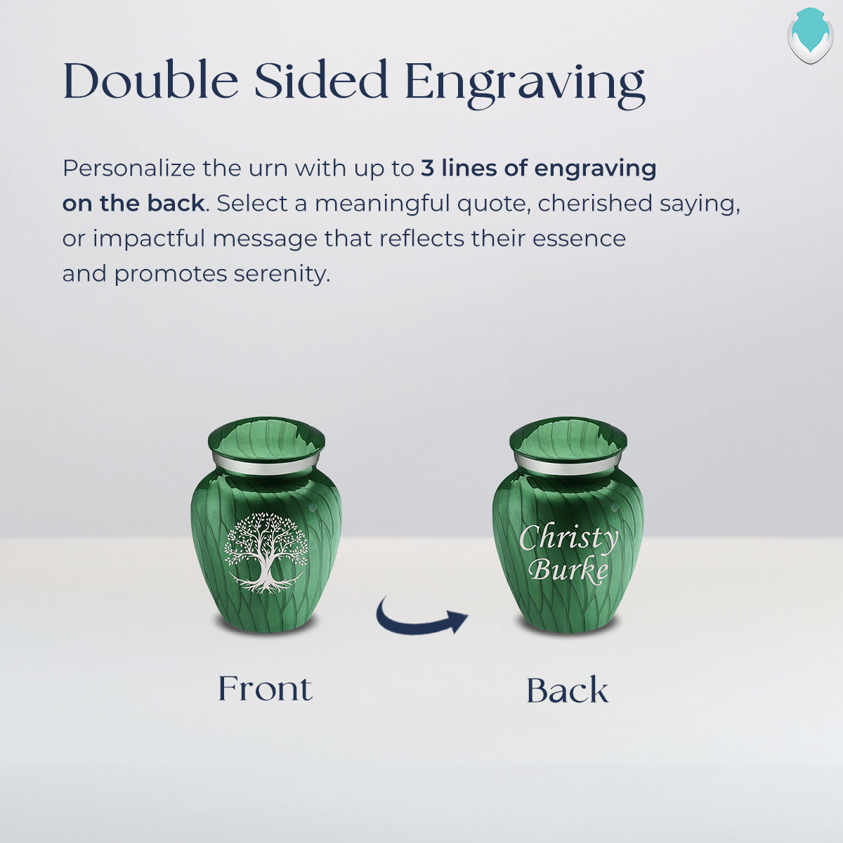 Our Adult Embrace Pearl Green Tree of Life Cremation Urn is a classic, amphora-shaped urn, ideal for someone who loved this Earth. Its bright green color is a vibrant background for the Tree of Life, an image famous in many religions and folktales around the world. The tree itself, branches above, roots below, represents the unifying life force behind the cycle of life and death.