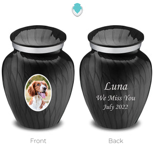 The Embrace Pearl Portrait Urn features a deep glossy black finish with a brushed pewter band just below its threaded lid. The black coloring represents sophistication, strength, and power, creating a meaningful tribute to honor your loved one's memory.
