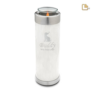 Tealight Urns with hand engraved paw prints in two designs, elongated and small. A perfect remembrance piece to light a candle in honor of the loved one. Threaded chamber opens at top. Protected with our GlossCoatTM technology. Handcrafted with Love by LoveUrns®
