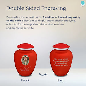 The Embrace Urn features a brilliant bright red finish with a brushed pewter band just below its threaded lid. The red coloring represents energy, love, and passion, creating a meaningful tribute to honor your loved one's memory.