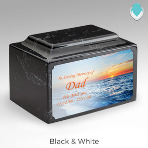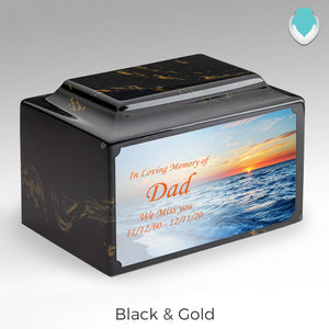 The Legacy has the capacity to be fully personalized, making these totally unique places to lay your loved one to rest. The custom UV printed plate included with these boxes are great for adding a touch of personality to the Legacy urns. Superior UV printing technology on the brass plate ensures crisp and detailed designs to celebrate your loved one’s life, hobbies, interests, and character.