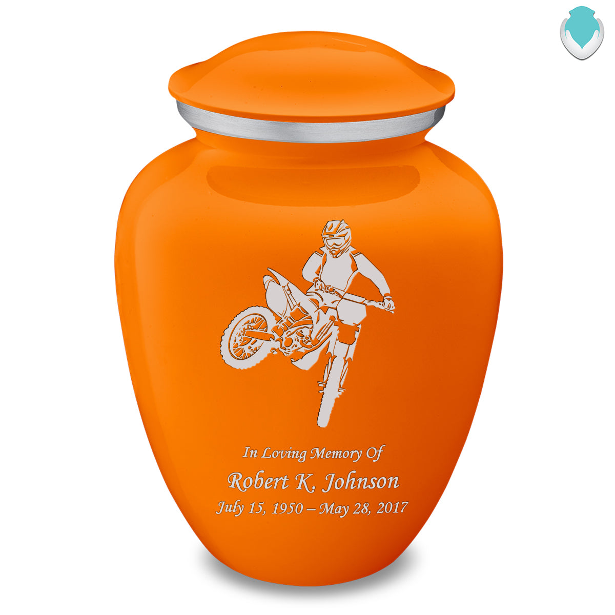 Honor the memory of your loved one with the Embrace Dirt Bike Cremation Urn for Ashes. This beautiful urn displays a rider on top of a dirt bike. This is a perfect resting place for someone adventurous who enjoyed riding off road.