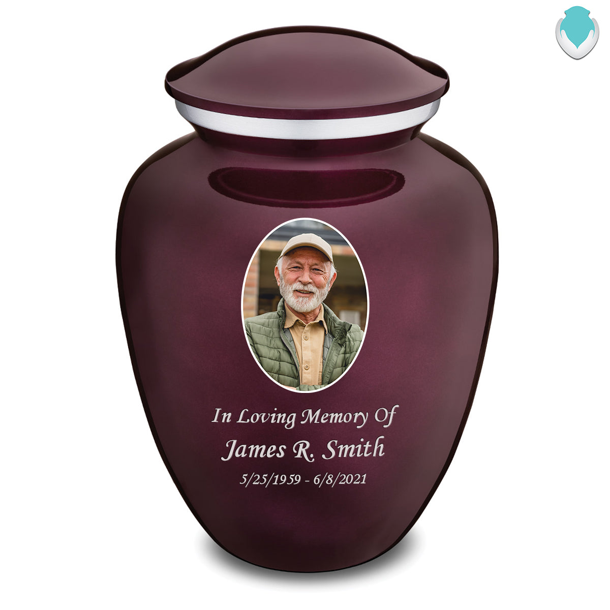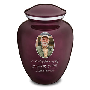 This Embrace Urn has a rich glossy cherry purple finish with a brushed pewter band just below its threaded lid. The cherry purple coloring represents happiness, loyalty, and devotion.