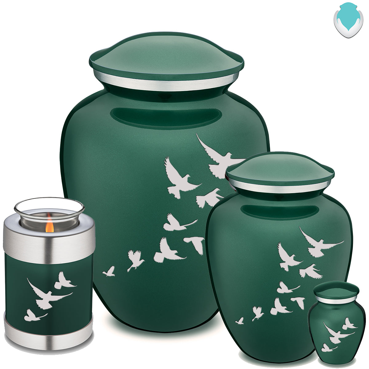 Honor the memory of your loved one with an Adult Embrace Doves Cremation Urn for Ashes. This beautiful urn displays a flock of doves flying upwards. This is a perfect resting place for someone who embodied freedom and peace.