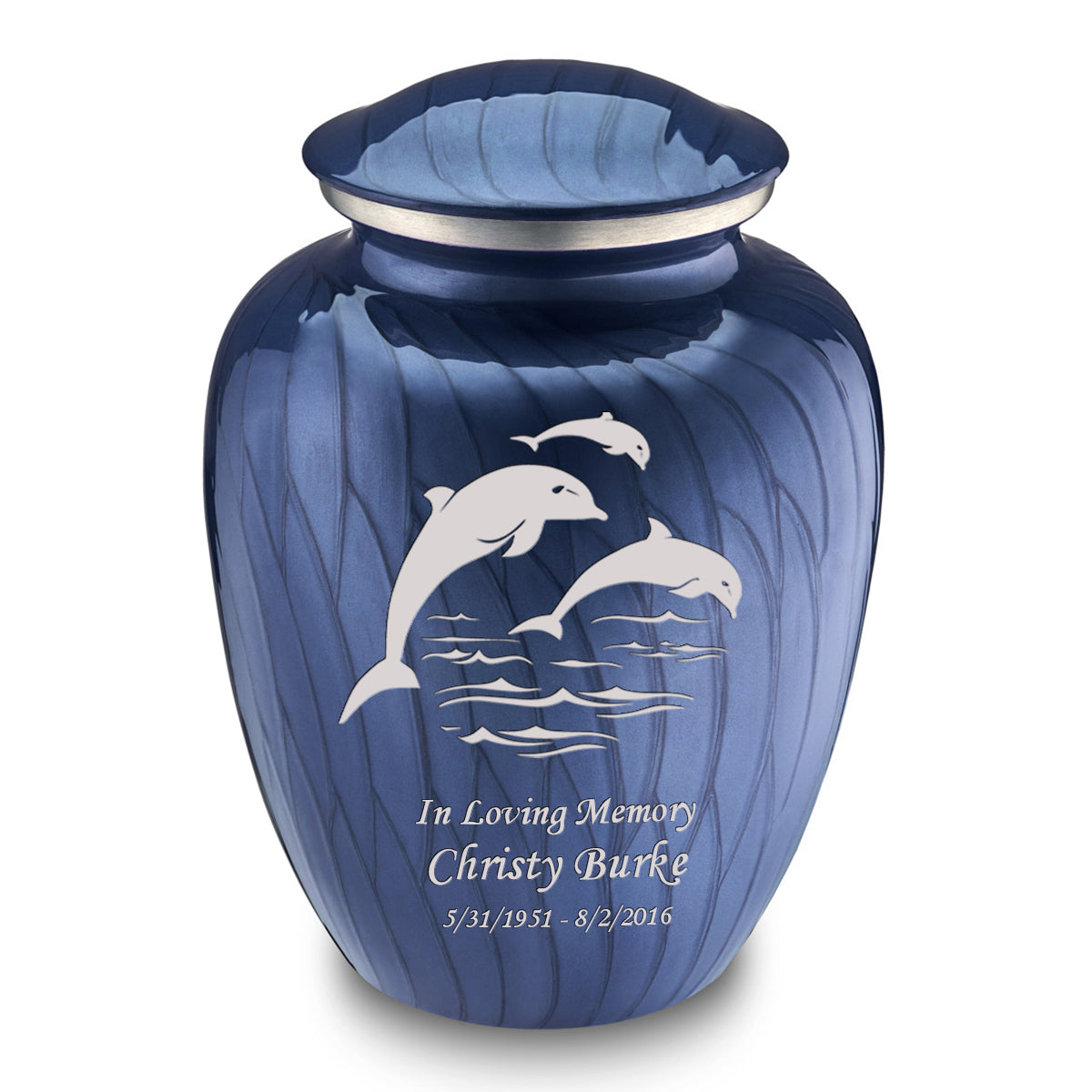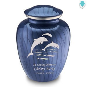 Honor the memory of your loved one with an Adult Embrace Pearl Blue Dolphins Cremation Urn for Ashes. This beautiful urn displays three dolphins jumping into the ocean. The dolphins represent harmony, peace, and is the perfect resting place for someone fond of marine life or the ocean.