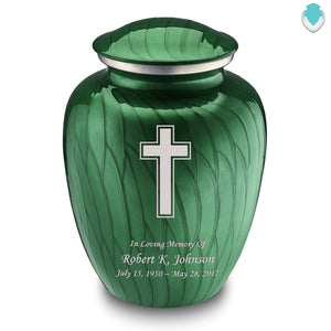 This Embrace Urn has a hand applied pearlescent green finish with a brushed pewter band just below its threaded lid. Embrace Pearlescent have a beautiful striated texture across the surface of the urn and lid. These striations are formed by the expert craftsmen's fingers as they apply each stroke of paint by hand with precision and care.