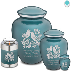 This Embrace Urn has an opaque glossy teal finish with a brushed pewter band just below its threaded lid. The teal coloring represents calmness, strength, and elegance.