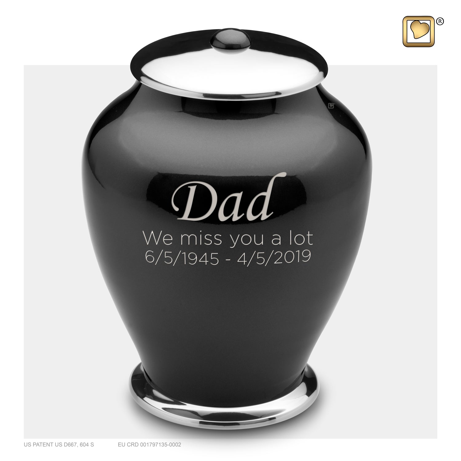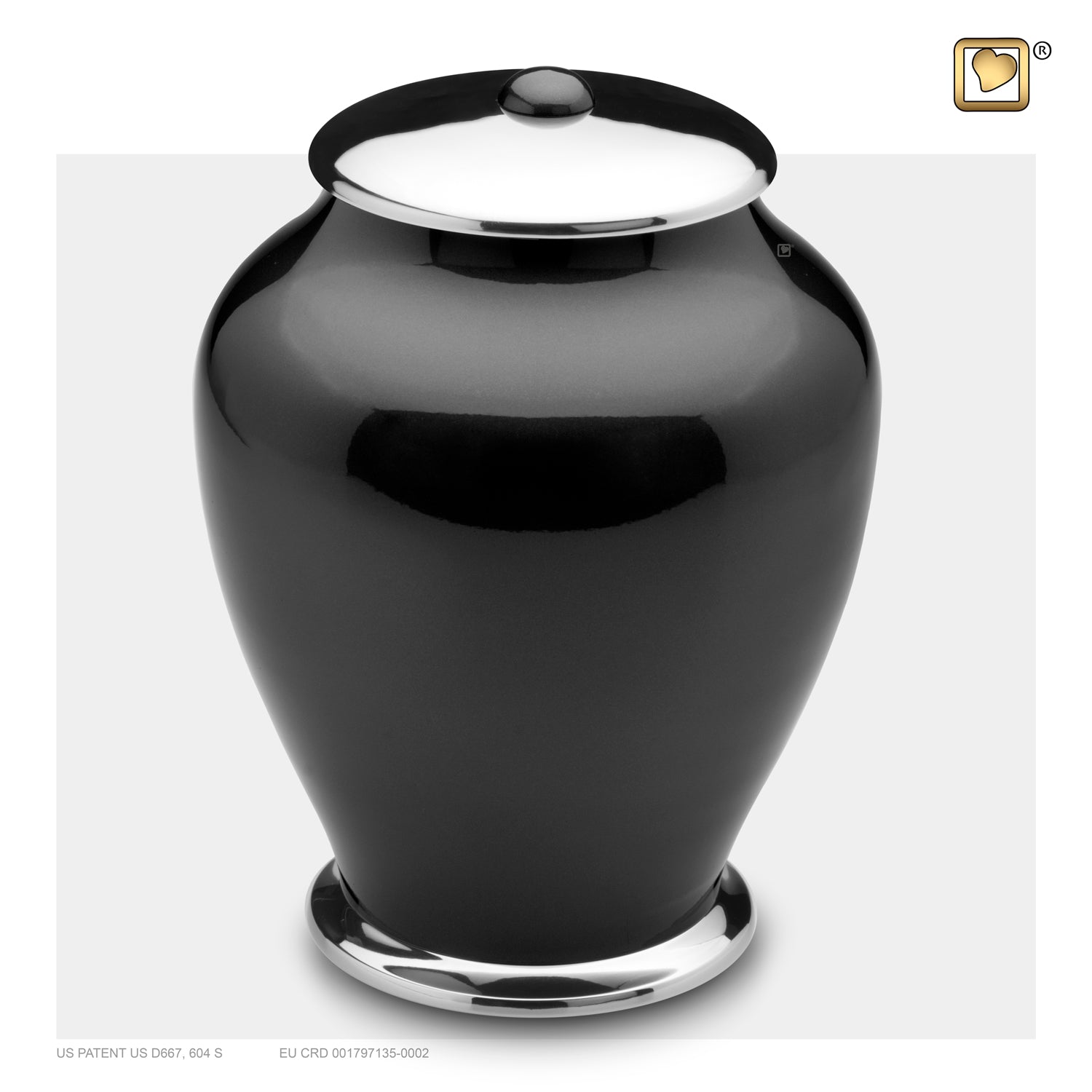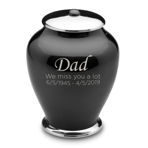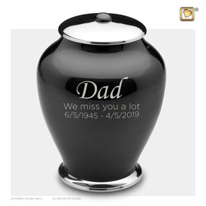 The Adult Tall Simplicity Midnight urn is blanketed in rich darkness with an obsidian finish coating the surface of the urn. In stunning contrast to the dark black glaze, the lid and bottom edges are left in a streakless silver finish to complement the design and make it cohesive.