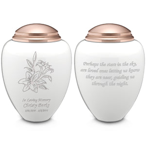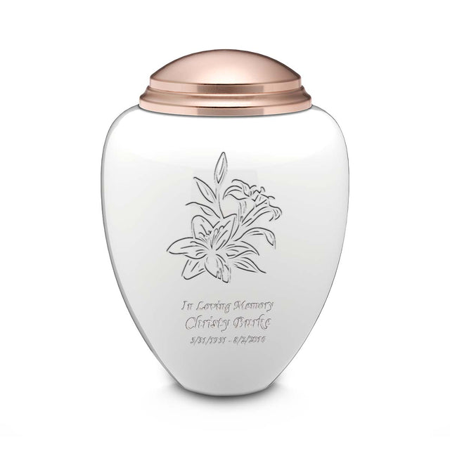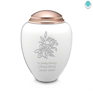 The hallmark of our Tribute Collection is the new, sleek oval silhouette in a selection of rich, gleaming colors accented with mixed metals that can only be found at GetUrns. This beautiful urn displays an elegant lily. This is a perfect resting place for someone who embodied love, hope, and passion. This cremation urn’s luminous, glossy white color and brushed rose gold cap is aesthetically pleasing, ultramodern and symbolizes serenity, hope, innocence, and elegance.