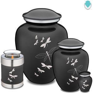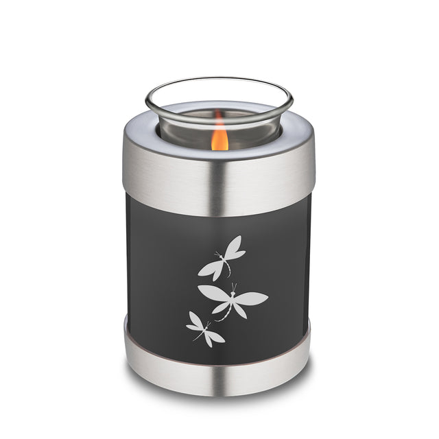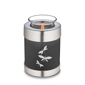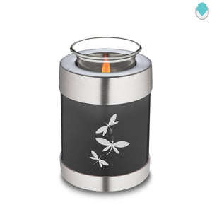 Honor the memory of your loved one with a Tealight Embrace Dragonflies Cremation Urn for Ashes. This beautiful urn displays a flight of silver dragonflies moving upwards. This is a perfect resting place for a free spirit, someone who enjoyed life, nature, harmony.