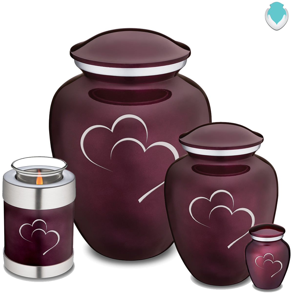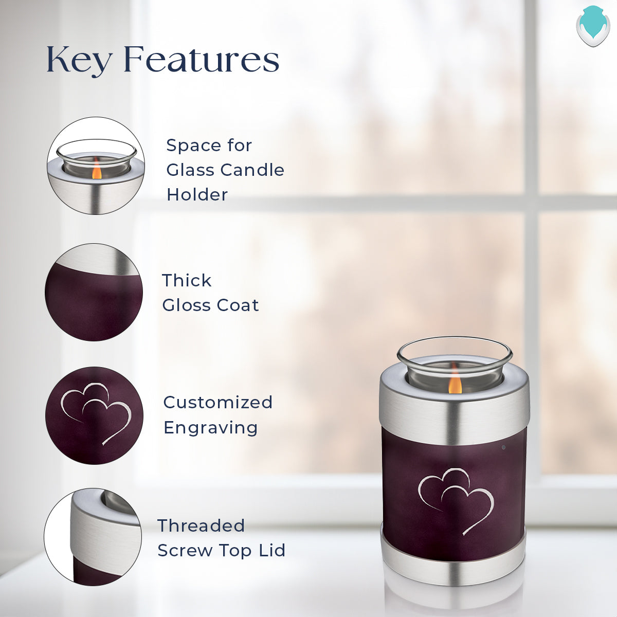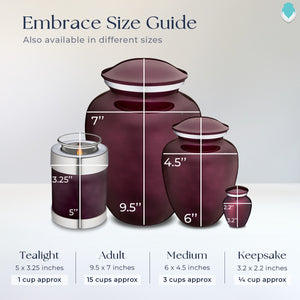 This Embrace Urn has a deep glossy Cherry Purple finish with a brushed pewter threaded lid. The cherry purple coloring represents happiness, loyalty, and devotion.