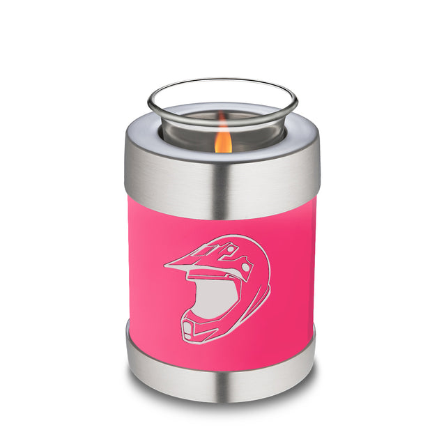 This Embrace Urn has a shiny bright pink finish with a brushed pewter threaded lid. The pink coloring represents love, playfulness, and harmony.