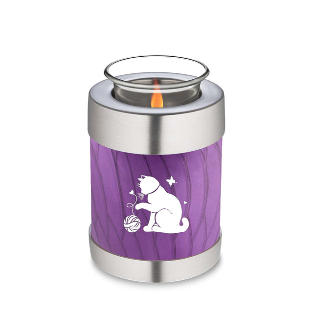 This Embrace Urn has a deep glossy pearl purple finish with a brushed pewter band just below its threaded lid. The coloring represents sophistication, strength, and power.