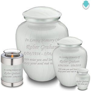 This Embrace Urn has a hand applied pearlescent white finish with a brushed pewter band just below its threaded lid. The white coloring represents innocence, hope, and serenity.