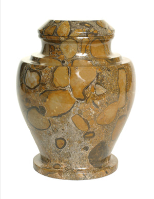 The Carpel Pebble Stone urn to stand out above all other of its kind made from one of the most beautiful natural stones around Pebble Stone. The Pebble Stone has White Brown Black and Gold natural veining which brings a one of a kind look. This stone is made from the earth crushing stones for years under the surface of the earth. The Carpel Pebble Stone urn is hand crafted using the best techniques in the industry.