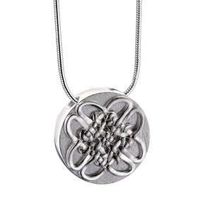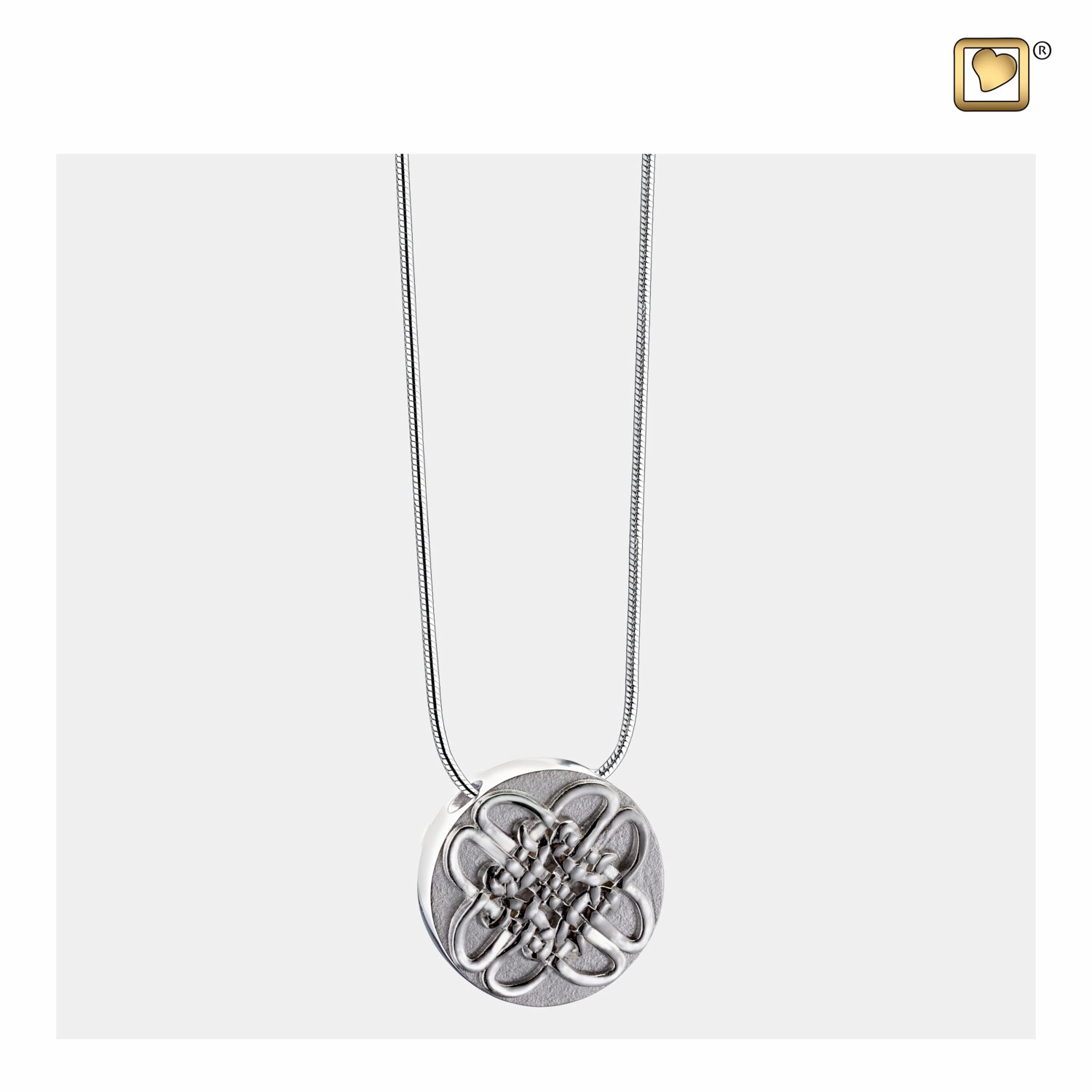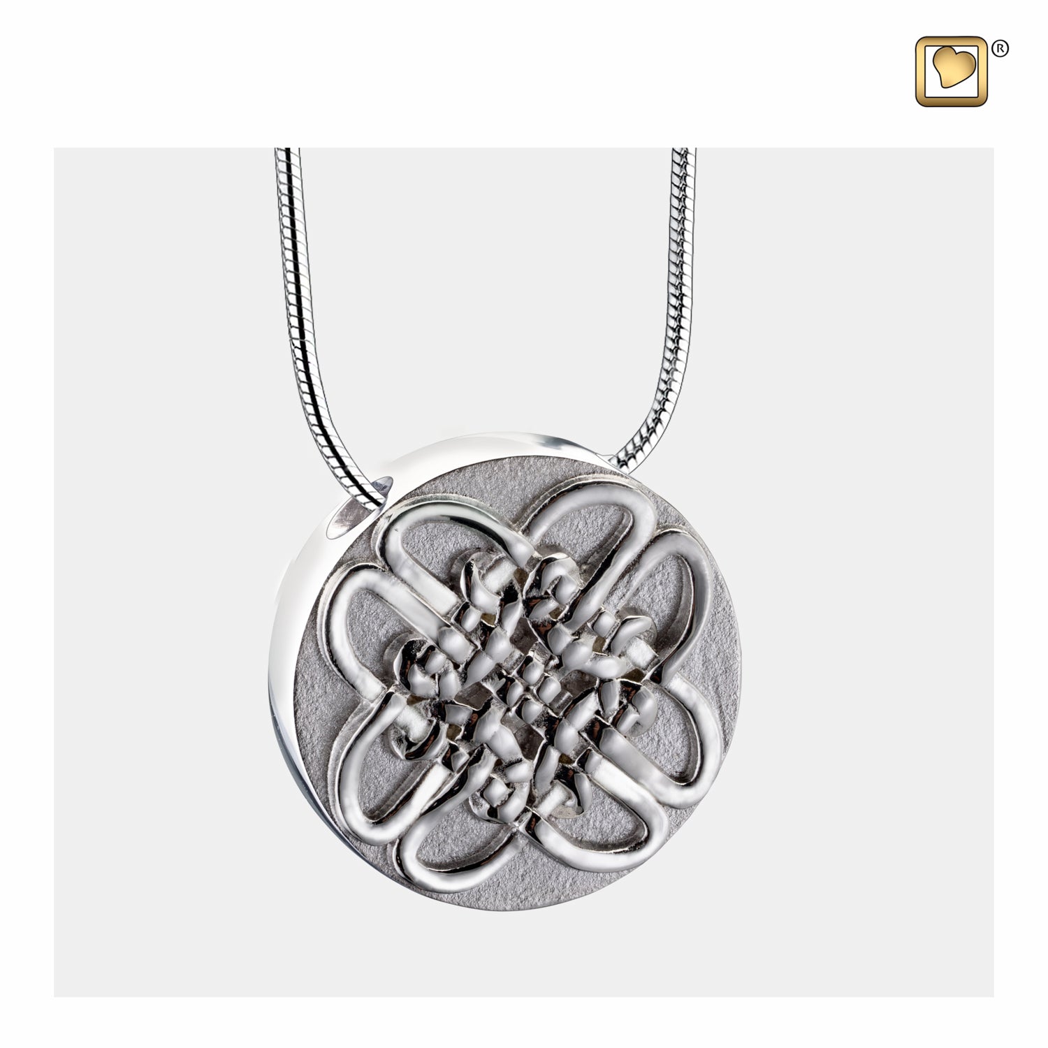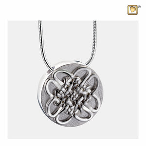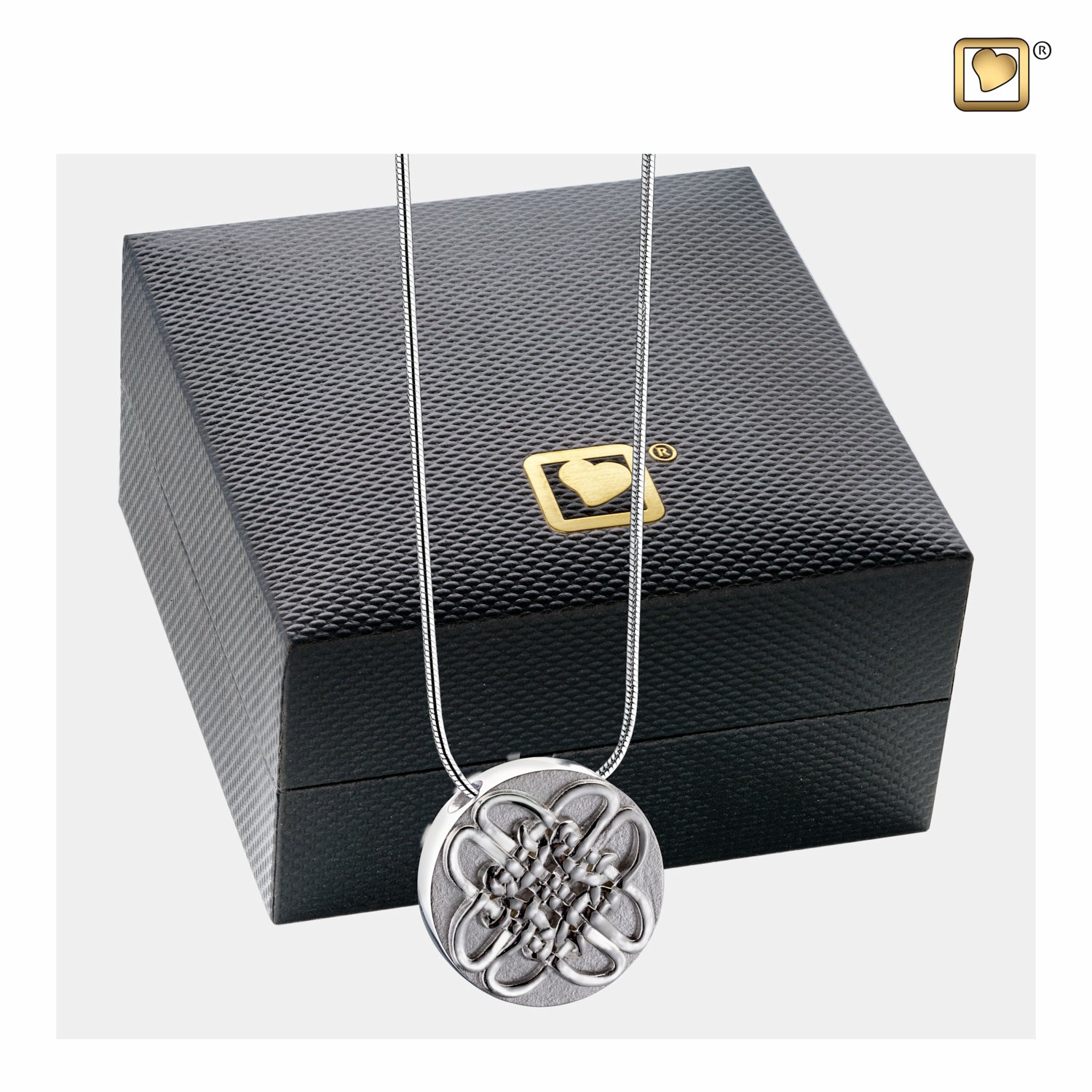 Commemorate your loved one with the gorgeous Celtic Circle Two Tone Cremation Pendant for ashes. The Celtic Circle pendant features a two-tone silver finish that has a micro hammered front and a shiny silver back.