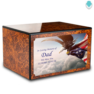 The Custom Printed Heritage American Eagle Wood Box Cremation Urn is perfect for someone who lived wild and free and who loved adventure and endless horizons. American Eagle often represent this freedom of spirit, and an attitude of daring and carefree nature.