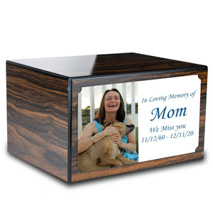 The plaques for these cremation urns are uniquely printed using state of the art full UV printing technology. UV inks capture true rich colors that not only look vibrant but are made to stand the test of time.