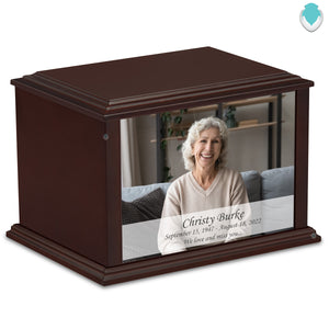 The Custom Printed Heritage Eternal Impressions Portrait Wood Box Cremation Urn is a perfect resting place for someone who embodied a gentle and comforting spirit and brought joy to those around them.