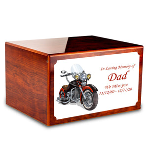 The Custom Printed Heritage Motorcycle Wood Box Cremation Urn is perfect for someone who lived wild and free and who loved adventure and endless horizons. Motorcycles often represent this freedom of spirit, and an attitude of daring and carefree nature.