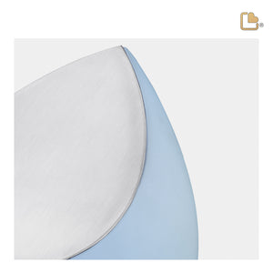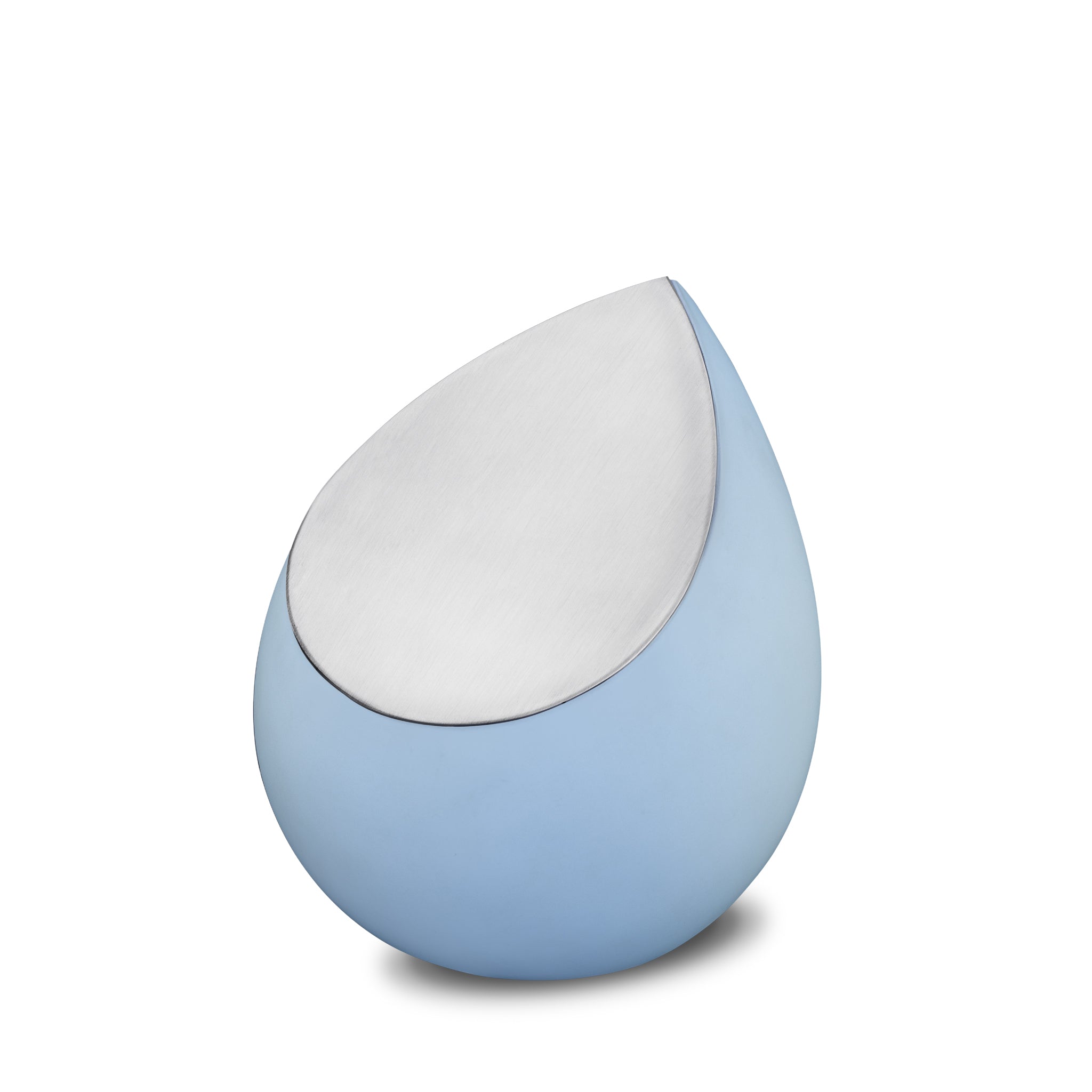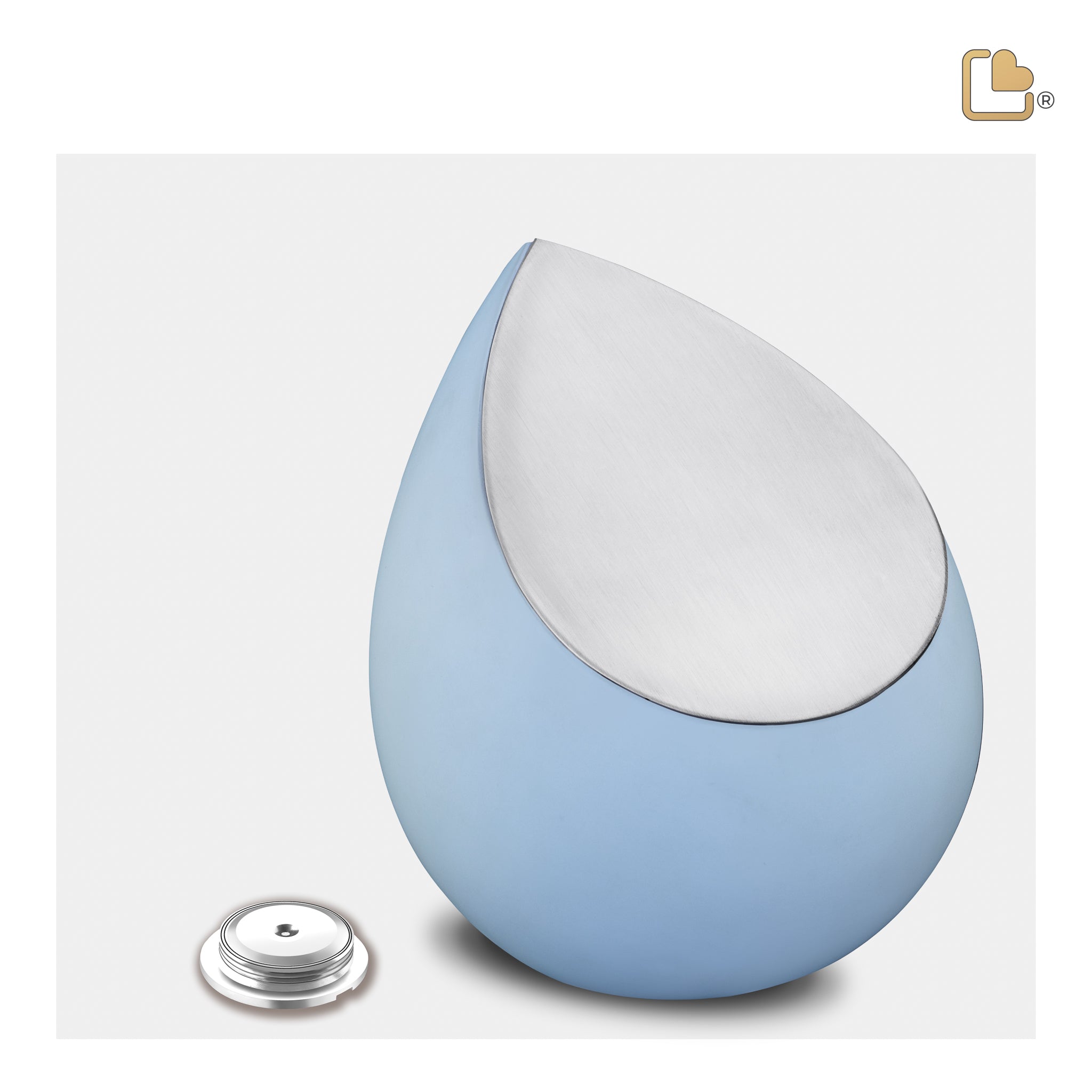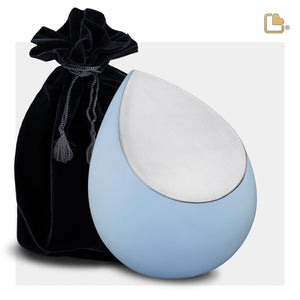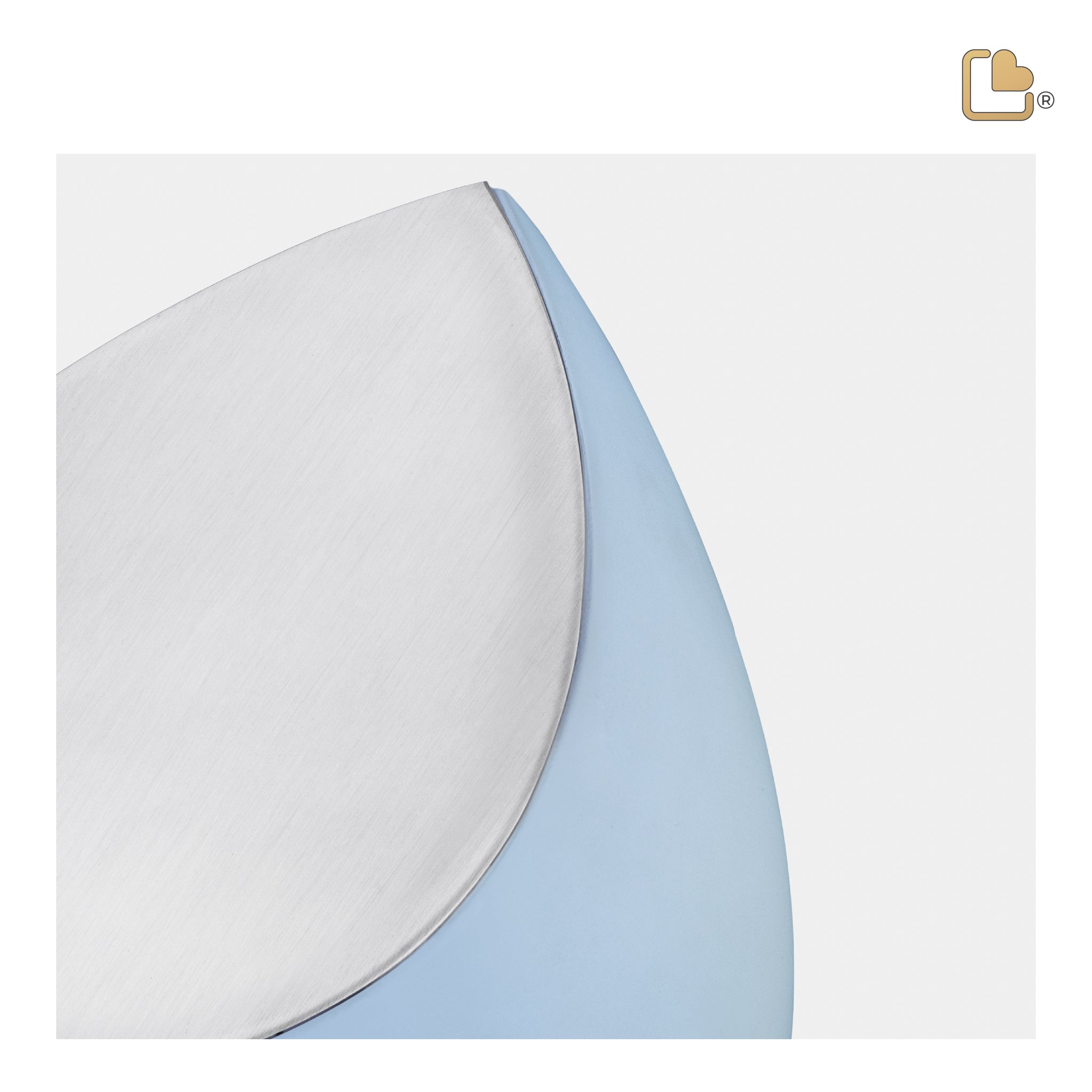 The Drop™ Medium Cremation Urn for sharing ashes exudes a sense of grace and tranquility. Baby blue color represents eternal love and innocence, while the brushed pewter accents add a touch of sophistication. This urn's design draws inspiration from the natural beauty of a teardrop, symbolizing the emotions and memories cherished within.