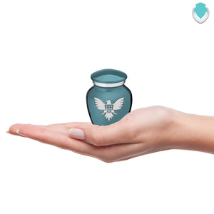 This Embrace Urn has an opaque glossy teal finish with a brushed pewter band just below its threaded lid. The teal coloring represents calmness, strength, and elegance.
