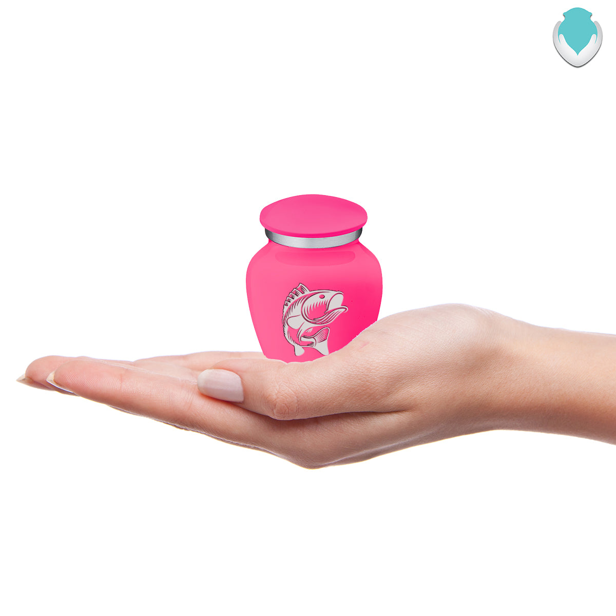 This Embrace Urn has a glossy bright pink finish with a brushed pewter band just below its threaded lid. The bright pink coloring represents love, playfulness, and harmony.