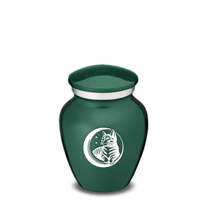 This Embrace Urn has a rich glossy green finish with a brushed pewter band just below its threaded lid. The green coloring represents the green of earthly life and nature, of vitality and energy.