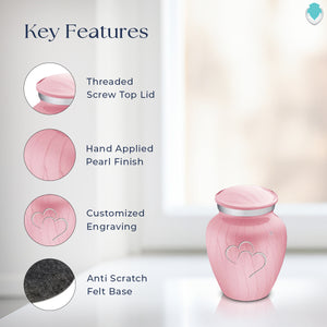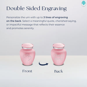 This Embrace Urn has a hand applied pearlescent pink finish with a brushed pewter band just below its threaded lid. The pink coloring represents joy, playfulness, and sweetness.