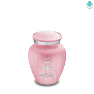 This Embrace Urn has a hand applied pearlescent pink finish with a brushed pewter band just below its threaded lid. The pink coloring represents joy, playfulness, and sweetness.
