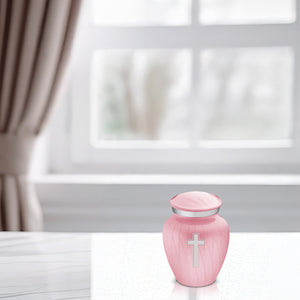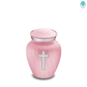 This Embrace Urn has a hand applied pearlescent pink finish with a brushed pewter band just below its threaded lid. The pink coloring represents joy, playfulness, and sweetness.