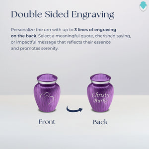 This Embrace Urn has a hand applied pearlescent purple finish with a brushed pewter band just below its threaded lid. The pearlescent purple coloring represents peace, luxury, nobility and devotion.