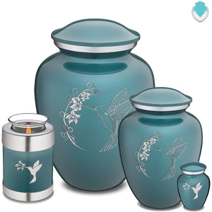 This Embrace Urn has an opaque glossy teal finish with a brushed pewter band just below its threaded lid. The teal coloring represents calmness, strength, and elegance.