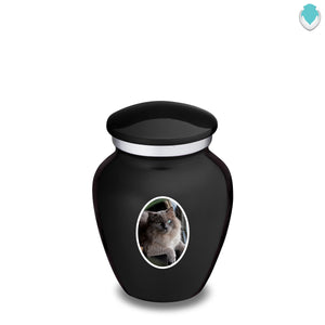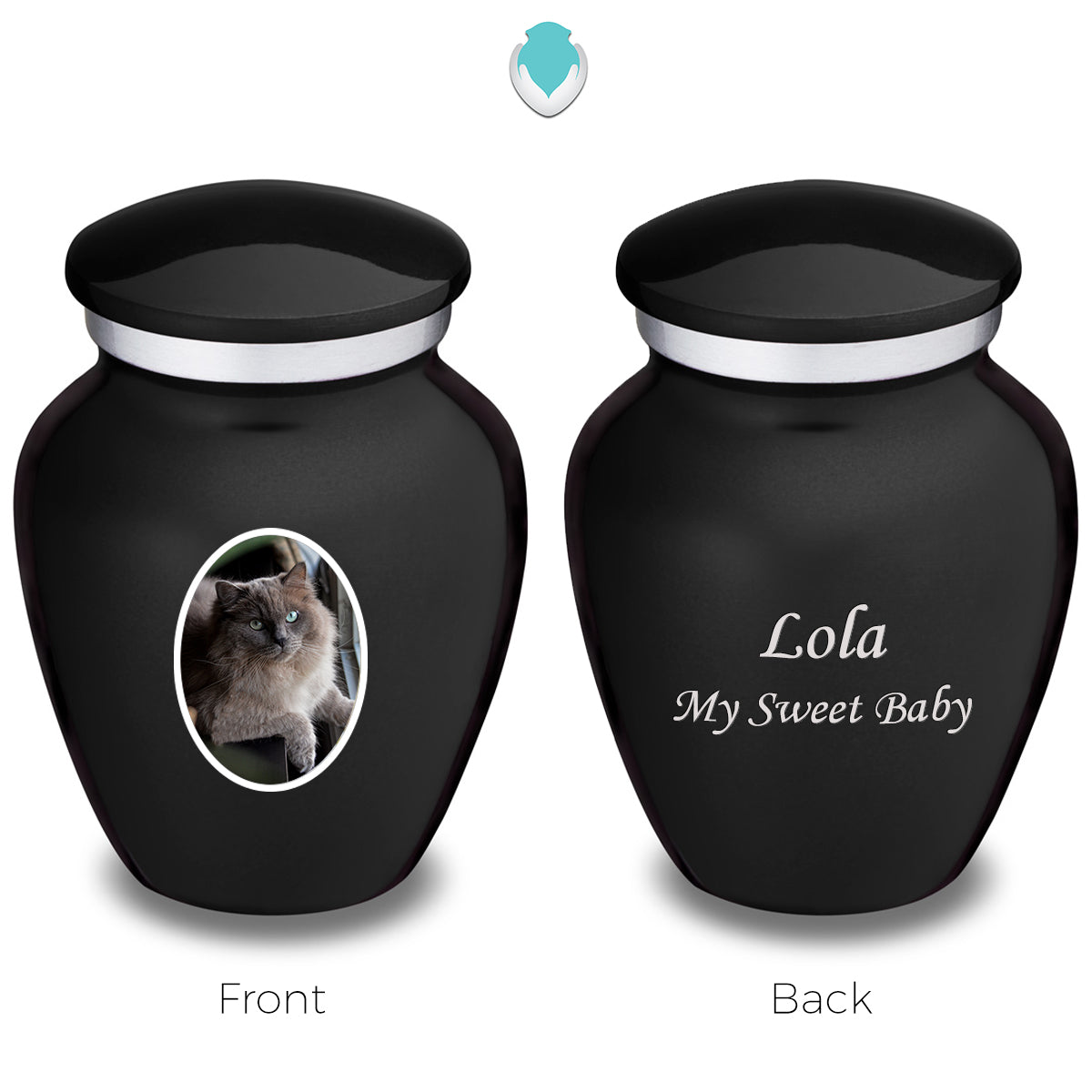 The Embrace Urn features a deep glossy black finish with a brushed pewter band just below its threaded lid. The black coloring represents sophistication, strength, and power, creating a meaningful tribute to honor your loved one's memory.