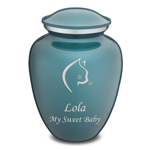 This Embrace Urn has an opaque glossy teal finish with a brushed pewter band just below its threaded lid. The teal coloring represents calmness, strength, and elegance.