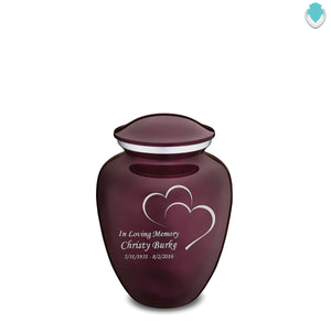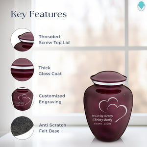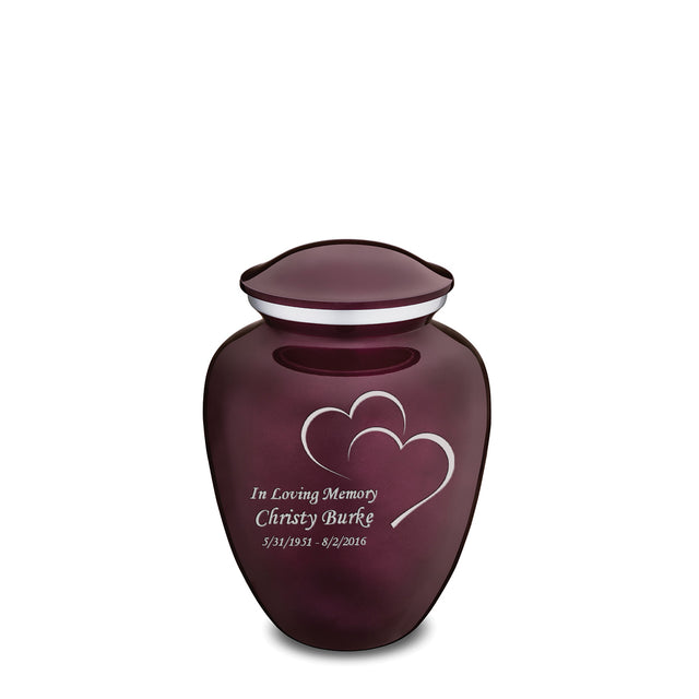 This Embrace Urn has a rich glossy cherry purple finish with a brushed pewter band just below its threaded lid. The cherry purple coloring represents happiness, loyalty, and devotion.