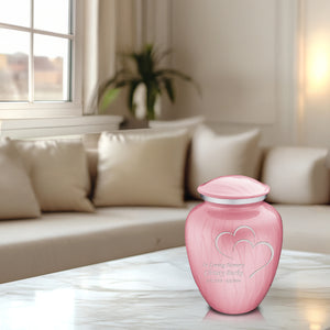 This Embrace Urn has a hand applied pearlescent pink finish with a brushed pewter band just below its threaded lid. The pink coloring represents joy, playfulness, and sweetness.