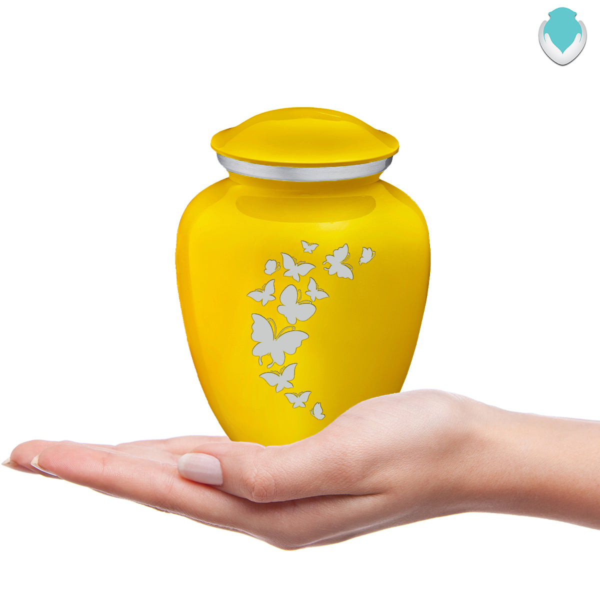 This Embrace Urn has a deep glossy yellow finish with a brushed pewter band just below its threaded lid. The yellow coloring represents sophistication, strength, and power.