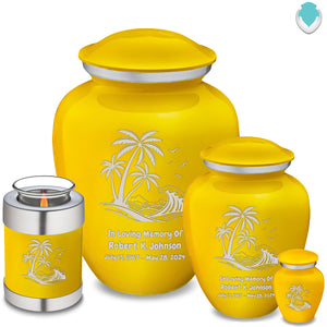 This Embrace Urn has a deep glossy yellow finish with a brushed pewter band just below its threaded lid. The yellow coloring represents sophistication, strength, and power.