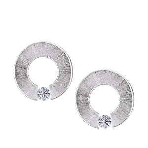Composed of Sterling Silver with Rhodium plating, these earrings also have a hand placed clear crystal in the center.