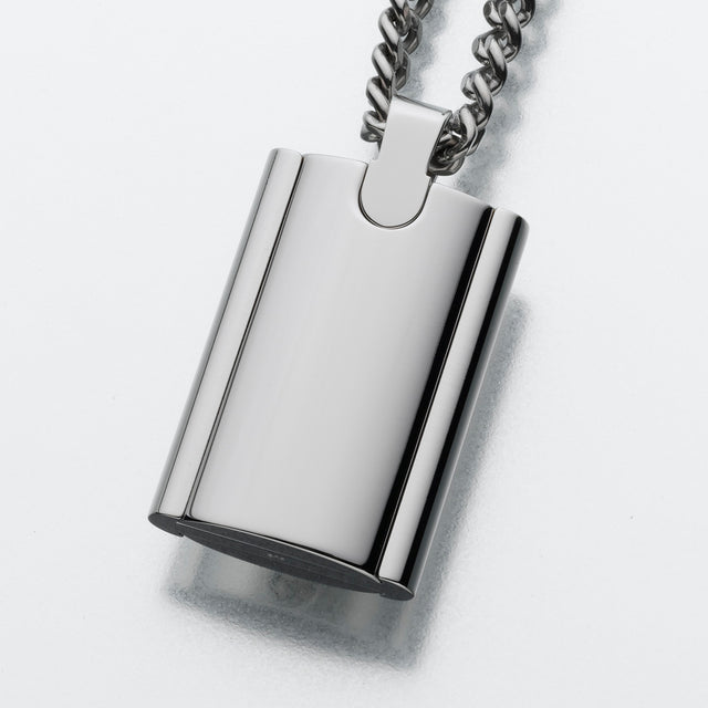 Made of durable polished stainless steel, this flask pendant is a more masculine piece that includes a 24" stainless steel chain. It has a sliding double screwed back panel for easy filling. Beveled edge on sides of pendant add character. Each piece of cremation jewelry can hold a small amount of cremation ashes.