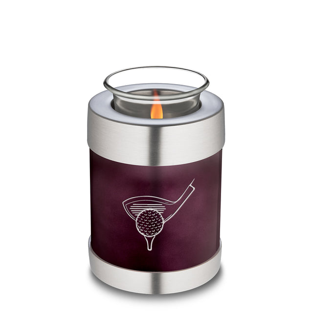 Honor the memory of your loved one with a Tealight Embrace Golfer Cremation Urn for Ashes. This beautiful urn displays a scene of a golfer swinging a club. This is a perfect resting place for someone who enjoyed golfing.