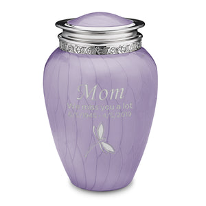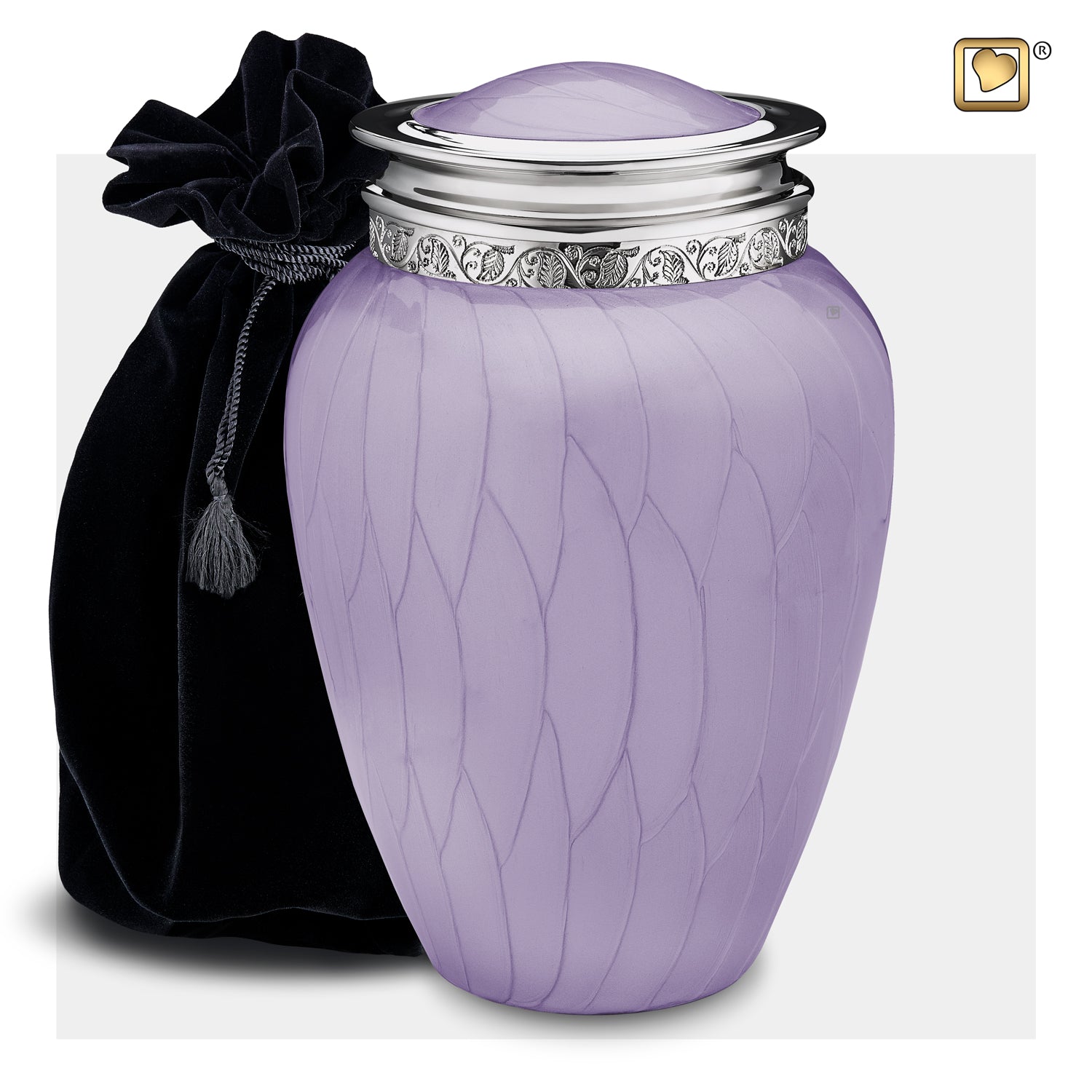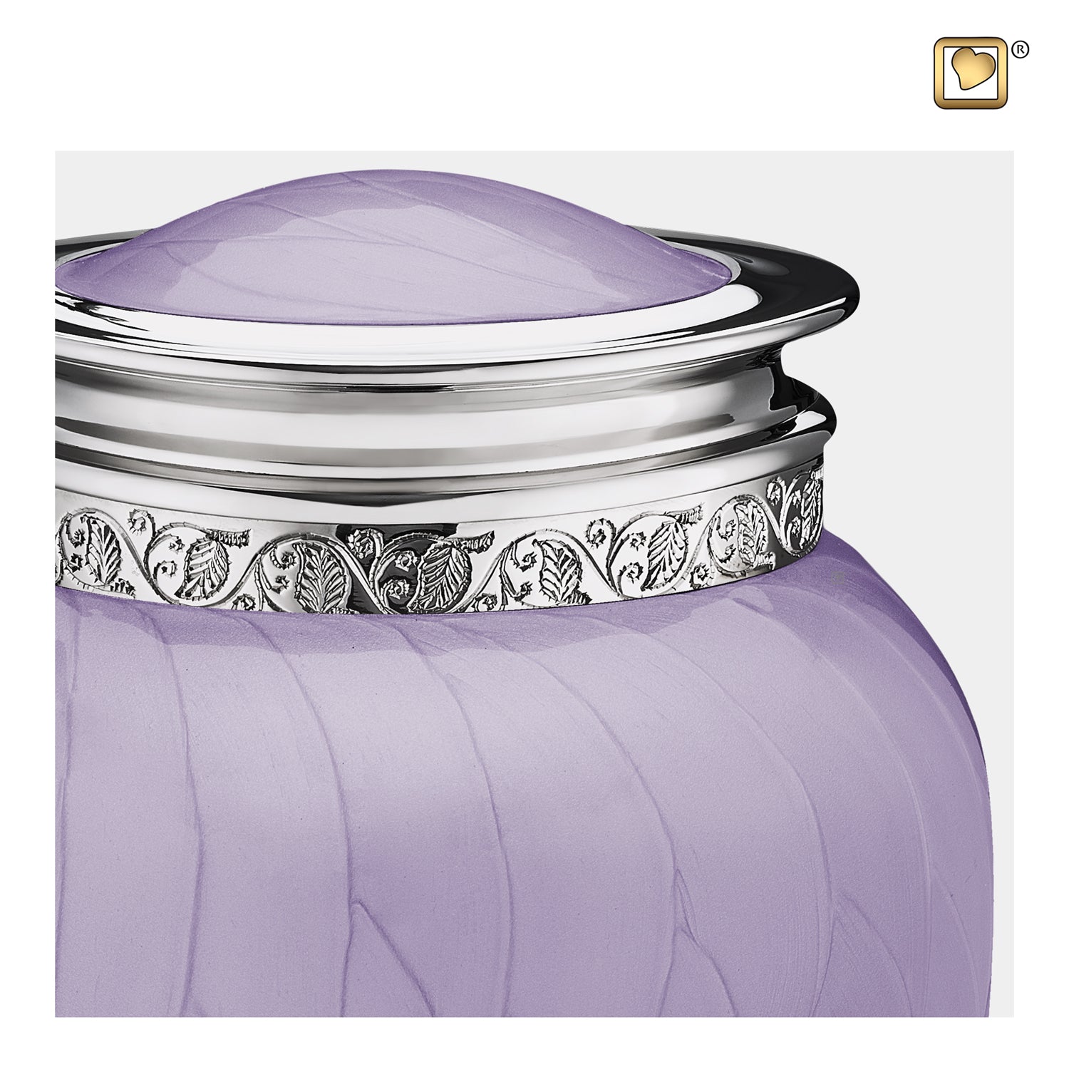 Artistically hand-crafted by skilled artisans with care and attention to detail, this adult funeral urn can hold up to 238 cu. inches of ashes. Crafted from high-quality brass alloy, this traditional-style urn stands out with its unique lavender pearlescent finish, applied by hand to create a soft, ethereal glow. The urn features exquisite silver detailing, particularly around the lid, where hand-carved vines gracefully adorn the edges.